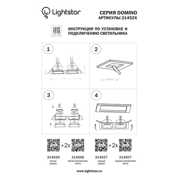Артикул: 214526; Бренд: Lightstar; Коллекция: Domino; Стиль: High-tech; место размещения: Жилая; Общественная; Тип крепления: Врезной; Пружинное; Материал каркаса: металл, Металл; Цвет каркаса: белый, Белый; Длина, мм: 215; Ширина, мм: 115; высота: 2; Длина потолочной чаши, мм: 180; Ширина потолочной чаши, мм: 80; Высота потолочной чаши, мм: 30; Вес, кг: 0,224; Штрихкод: 8050046561951